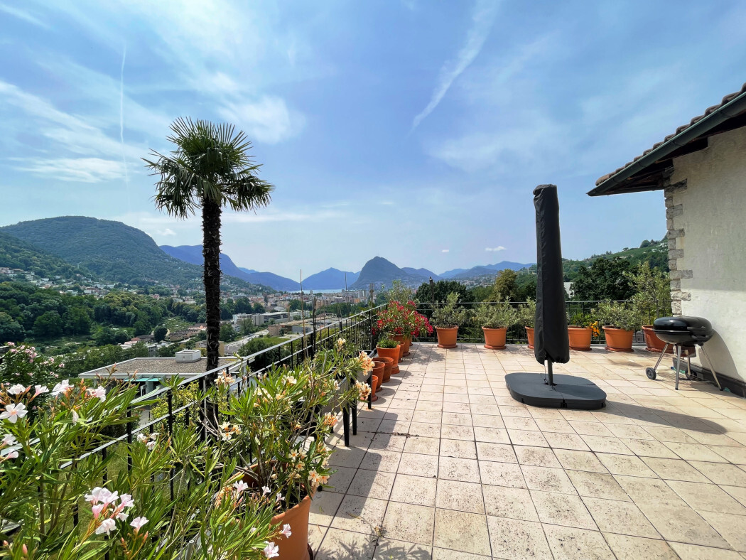 Accogliente casa bifamiliare in bella zona residenziale soleggiata, appena al di sotto del villaggio, con una spettacolare vista panoramica sul lago e sulla vallata di Lugano.